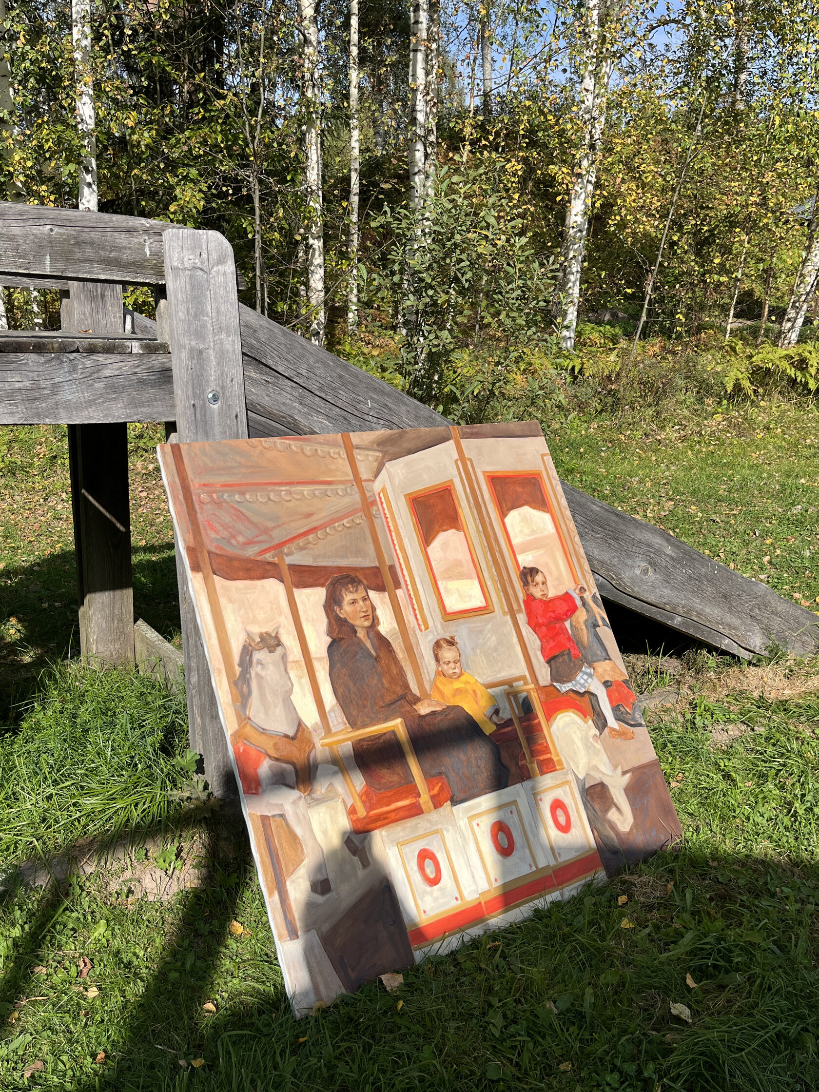 Время на Академической даче мы распределяли самостоятельно: ходили на пленэры, делали эскизы, писали этюды и портреты. В течение трех неделей нужно было создать либо одну работу, у которой большая сторона составляет 140 сантиметров, либо несколько картин меньшего формата. Тема свободная, но лучше продумать ее заранее: подготовить несколько идей и, в идеале, выбрать одну, над которой будешь работать. Это можно сделать и в процессе, но это отнимает время. Я, к примеру, в качестве темы выбрала детство — и написала серию картин, посвященных моей семье. По приезде домой я продолжила работу над ними.